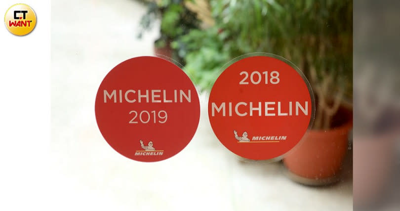 上林鐵板燒入口透明門上有兩張紅色圓貼紙─2018及2019的「米其林餐盤推薦」。(圖/王永泰攝)
